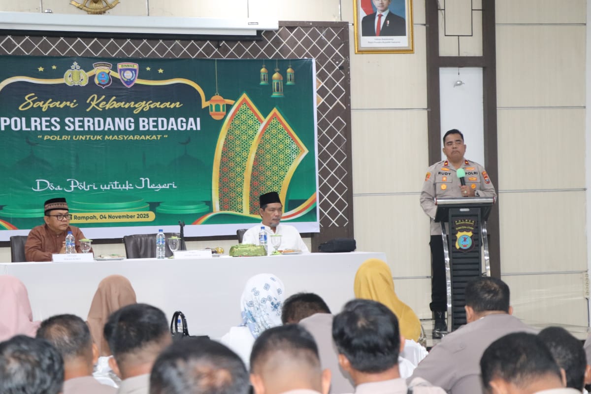 Sergai, Sumut. OPSINEWS.COM - Kepolisian Daerah Sumatera Utara (Polda Sumut) melalui Polres Serdang Bedagai (Sergai) menggelar kegiatan Safari Kebangsaan bertema “Doa Polri untuk Negeri” di Aula Patriatama Polres Sergai, Selasa (4/11/2025).